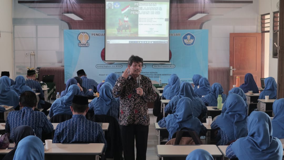 Sugiman memberikan materi tentang penguatan pembelajaran dan penilaian dalam rangka menyiapkan generasi emas yang cerdas berkarakter menyongsong abad 21. Ketua Pusat Kajian ABK MIPA UNNES tersebut mengajak kepada seluruh tenaga pendidik agar menyelaraskan diri dengan zaman. “Sebagai guru hanya satu peran kita yang tidak dapat tergantikan oleh aplikasi yang sedang viral di Indonesia yaitu mendidik”, ungkapnya.