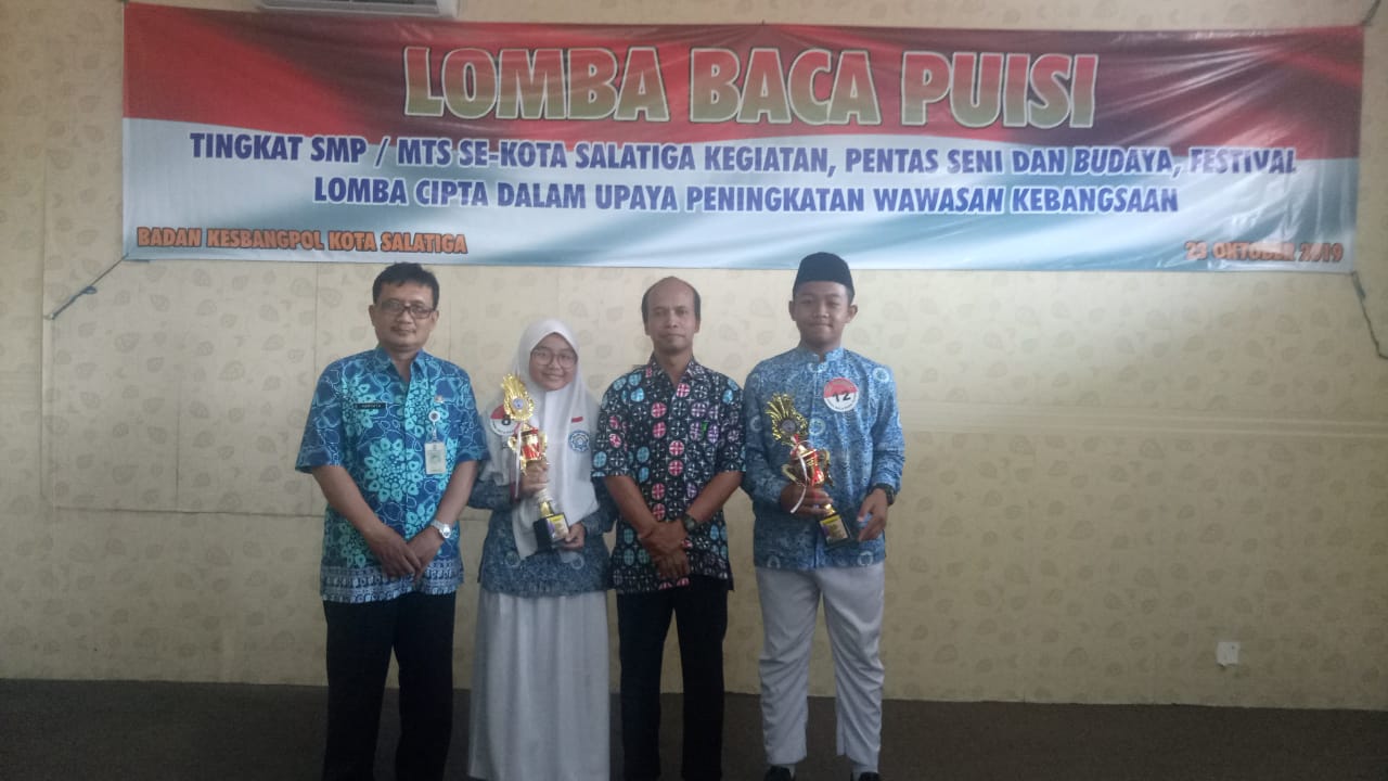 Ratih Wintang Kinaryosih dan Muhammad Naufal Dzaky berhasil mendapatkan gelar juara pada Lomba Baca Puisi Tingkat SMP/MTs se-Kota Salatiga yang diadakan oleh Badan Kesbangpol Kota Salatiga (23/10).